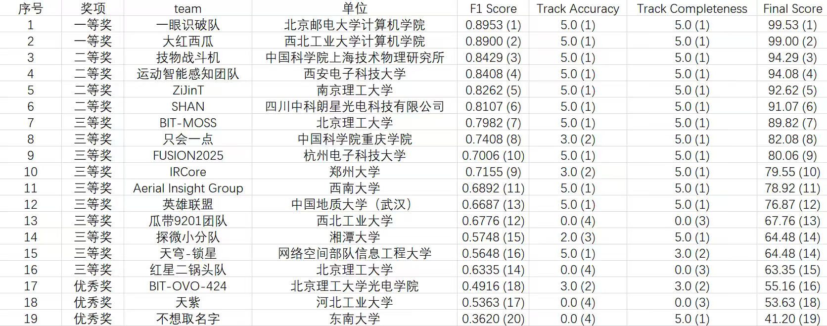 评ICIG2025 第六届CSIG图像图形技术挑战赛—红外视频卫星空中动目标检测(SatVideoIRSTD)赛道获奖队伍名单公示如下: